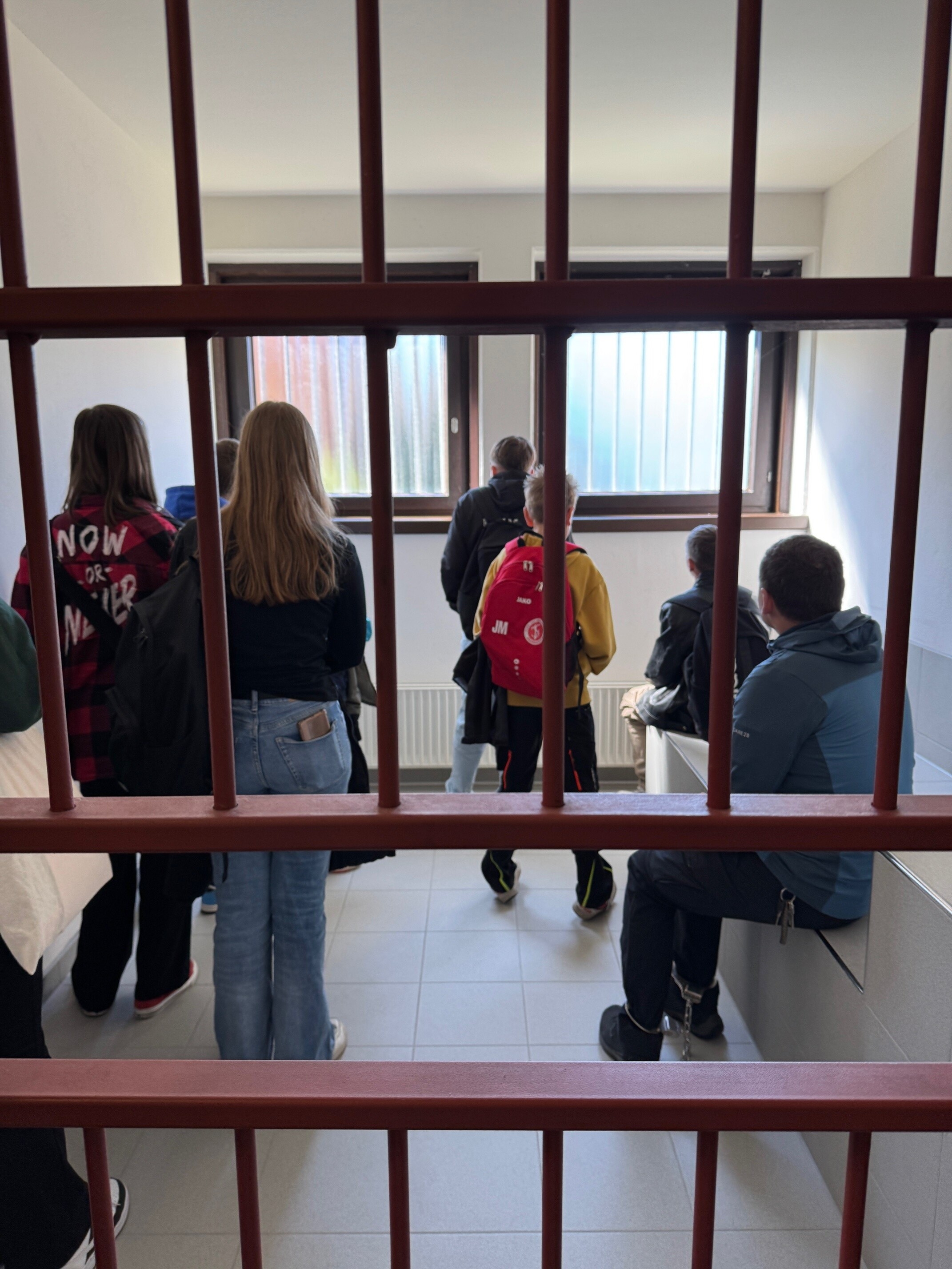 Ein besonderes Highlight war die Besichtigung einer Vorführzelle. Dort wurde den Schülerinnen und Schülern anschaulich erklärt, wie eine Vorführung von Angeklagten abläuft – inklusive einer Demonstration von Hand- und Fußfesseln, die in solchen Fällen zum Einsatz kommen.